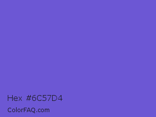 Hex #6c57d4 Color is a normal indigo color and the nearest color is Slate Blue #6a5acd. Hex code #6c57d4 and RGB value is rgb(108,87,212). In RGB color space, this color is composed of 42% red, 34% green, 83% blue, In CMYK color space, this color is composed of 49% cyan, 59% magenta, 0% yellow , 17% black , In HSL color space, this color has a hue angle of 250° , 59% saturation and 59% lightness.