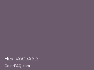 Hex #6c5a6d Color is a normal magenta color and the nearest color is Salt Box #685e6e. Hex code #6c5a6d and RGB value is rgb(108,90,109). In RGB color space, this color is composed of 42% red, 35% green, 43% blue, In CMYK color space, this color is composed of 1% cyan, 17% magenta, 0% yellow , 57% black , In HSL color space, this color has a hue angle of 297° , 10% saturation and 39% lightness.