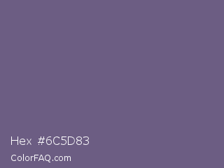 Hex #6c5d83 Color is a normal violet color and the nearest color is Dolphin #646077. Hex code #6c5d83 and RGB value is rgb(108,93,131). In RGB color space, this color is composed of 42% red, 36% green, 51% blue, In CMYK color space, this color is composed of 18% cyan, 29% magenta, 0% yellow , 49% black , In HSL color space, this color has a hue angle of 264° , 17% saturation and 44% lightness.