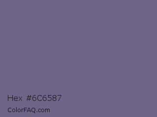 Hex #6c6587 Color is a normal indigo color and the nearest color is Rum #796989. Hex code #6c6587 and RGB value is rgb(108,101,135). In RGB color space, this color is composed of 42% red, 40% green, 53% blue, In CMYK color space, this color is composed of 20% cyan, 25% magenta, 0% yellow , 47% black , In HSL color space, this color has a hue angle of 252° , 14% saturation and 46% lightness.