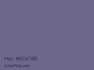 Hex #6c678b Color is a normal indigo color and the nearest color is Rum #796989. Hex code #6c678b and RGB value is rgb(108,103,139). In RGB color space, this color is composed of 42% red, 40% green, 55% blue, In CMYK color space, this color is composed of 22% cyan, 26% magenta, 0% yellow , 45% black , In HSL color space, this color has a hue angle of 248° , 15% saturation and 47% lightness.