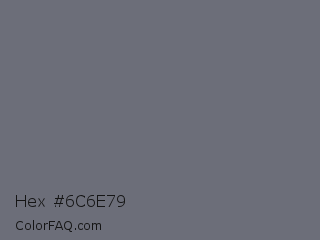 Hex #6c6e79 Color is a normal blue color and the nearest color is Nevada #646e75. Hex code #6c6e79 and RGB value is rgb(108,110,121). In RGB color space, this color is composed of 42% red, 43% green, 47% blue, In CMYK color space, this color is composed of 11% cyan, 9% magenta, 0% yellow , 53% black , In HSL color space, this color has a hue angle of 231° , 6% saturation and 45% lightness.