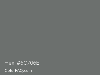 Hex #6c706e Color is a normal green color and the nearest color is Dove Gray #6d6c6c. Hex code #6c706e and RGB value is rgb(108,112,110). In RGB color space, this color is composed of 42% red, 44% green, 43% blue, In CMYK color space, this color is composed of 4% cyan, 0% magenta, 2% yellow , 56% black , In HSL color space, this color has a hue angle of 150° , 2% saturation and 43% lightness.