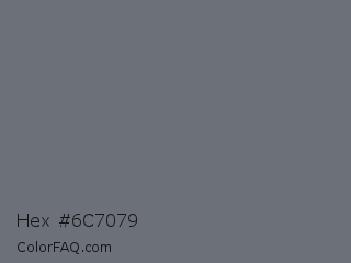 Hex #6c7079 Color is a normal blue color and the nearest color is Nevada #646e75. Hex code #6c7079 and RGB value is rgb(108,112,121). In RGB color space, this color is composed of 42% red, 44% green, 47% blue, In CMYK color space, this color is composed of 11% cyan, 7% magenta, 0% yellow , 53% black , In HSL color space, this color has a hue angle of 222° , 6% saturation and 45% lightness.