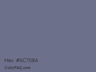 Hex #6c708a Color is a normal blue color and the nearest color is Storm Gray #717486. Hex code #6c708a and RGB value is rgb(108,112,138). In RGB color space, this color is composed of 42% red, 44% green, 54% blue, In CMYK color space, this color is composed of 22% cyan, 19% magenta, 0% yellow , 46% black , In HSL color space, this color has a hue angle of 232° , 12% saturation and 48% lightness.