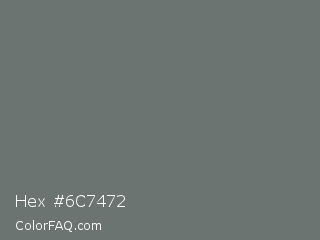 Hex #6c7472 Color is a normal cyan color and the nearest color is Nickel #727472. Hex code #6c7472 and RGB value is rgb(108,116,114). In RGB color space, this color is composed of 42% red, 45% green, 45% blue, In CMYK color space, this color is composed of 7% cyan, 0% magenta, 2% yellow , 55% black , In HSL color space, this color has a hue angle of 165° , 4% saturation and 44% lightness.