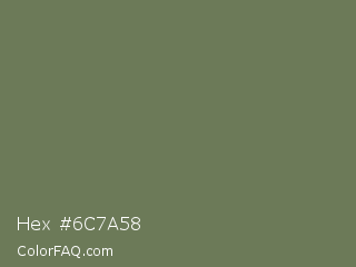 Hex #6c7a58 Color is a normal green color and the nearest color is Willow Grove #65745d. Hex code #6c7a58 and RGB value is rgb(108,122,88). In RGB color space, this color is composed of 42% red, 48% green, 35% blue, In CMYK color space, this color is composed of 11% cyan, 0% magenta, 28% yellow , 52% black , In HSL color space, this color has a hue angle of 85° , 16% saturation and 41% lightness.