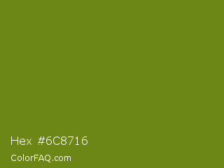 Hex #6c8716 Color is a normal lime color and the nearest color is Olive Drab #6b8e23. Hex code #6c8716 and RGB value is rgb(108,135,22). In RGB color space, this color is composed of 42% red, 53% green, 9% blue, In CMYK color space, this color is composed of 20% cyan, 0% magenta, 84% yellow , 47% black , In HSL color space, this color has a hue angle of 74° , 72% saturation and 31% lightness.