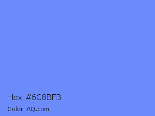 Hex #6c8bfb Color is a light blue color and the nearest color is Cornflower Blue #6495ed. Hex code #6c8bfb and RGB value is rgb(108,139,251). In RGB color space, this color is composed of 42% red, 55% green, 98% blue, In CMYK color space, this color is composed of 57% cyan, 45% magenta, 0% yellow , 2% black , In HSL color space, this color has a hue angle of 227° , 95% saturation and 70% lightness.