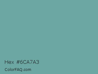 Hex #6ca7a3 Color is a normal cyan color and the nearest color is Green Sheen #6eaea1. Hex code #6ca7a3 and RGB value is rgb(108,167,163). In RGB color space, this color is composed of 42% red, 65% green, 64% blue, In CMYK color space, this color is composed of 35% cyan, 0% magenta, 2% yellow , 35% black , In HSL color space, this color has a hue angle of 176° , 25% saturation and 54% lightness.