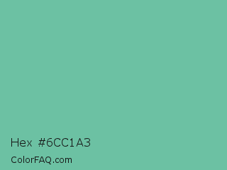Hex #6cc1a3 Color is a normal green color and the nearest color is Green Sheen #6eaea1. Hex code #6cc1a3 and RGB value is rgb(108,193,163). In RGB color space, this color is composed of 42% red, 76% green, 64% blue, In CMYK color space, this color is composed of 44% cyan, 0% magenta, 16% yellow , 24% black , In HSL color space, this color has a hue angle of 159° , 41% saturation and 59% lightness.