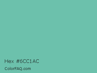 Hex #6cc1ac Color is a normal cyan color and the nearest color is Tradewind #5fb3ac. Hex code #6cc1ac and RGB value is rgb(108,193,172). In RGB color space, this color is composed of 42% red, 76% green, 67% blue, In CMYK color space, this color is composed of 44% cyan, 0% magenta, 11% yellow , 24% black , In HSL color space, this color has a hue angle of 165° , 41% saturation and 59% lightness.