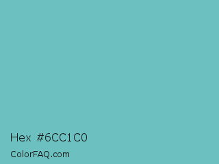 Hex #6cc1c0 Color is a normal cyan color and the nearest color is Downy #6fd0c5. Hex code #6cc1c0 and RGB value is rgb(108,193,192). In RGB color space, this color is composed of 42% red, 76% green, 75% blue, In CMYK color space, this color is composed of 44% cyan, 0% magenta, 1% yellow , 24% black , In HSL color space, this color has a hue angle of 179° , 41% saturation and 59% lightness.
