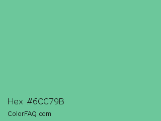 Hex #6cc79b Color is a normal green color and the nearest color is Silver Tree #66b58f. Hex code #6cc79b and RGB value is rgb(108,199,155). In RGB color space, this color is composed of 42% red, 78% green, 61% blue, In CMYK color space, this color is composed of 46% cyan, 0% magenta, 22% yellow , 22% black , In HSL color space, this color has a hue angle of 151° , 45% saturation and 60% lightness.