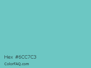 Hex #6cc7c3 Color is a normal cyan color and the nearest color is Downy #6fd0c5. Hex code #6cc7c3 and RGB value is rgb(108,199,195). In RGB color space, this color is composed of 42% red, 78% green, 76% blue, In CMYK color space, this color is composed of 46% cyan, 0% magenta, 2% yellow , 22% black , In HSL color space, this color has a hue angle of 177° , 45% saturation and 60% lightness.