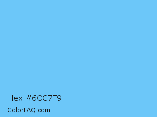 Hex #6cc7f9 Color is a light blue color and the nearest color is Maya Blue #73c2fb. Hex code #6cc7f9 and RGB value is rgb(108,199,249). In RGB color space, this color is composed of 42% red, 78% green, 98% blue, In CMYK color space, this color is composed of 57% cyan, 20% magenta, 0% yellow , 2% black , In HSL color space, this color has a hue angle of 201° , 92% saturation and 70% lightness.