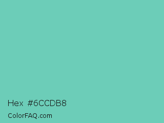Hex #6ccdb8 Color is a light cyan color and the nearest color is Downy #6fd0c5. Hex code #6ccdb8 and RGB value is rgb(108,205,184). In RGB color space, this color is composed of 42% red, 80% green, 72% blue, In CMYK color space, this color is composed of 47% cyan, 0% magenta, 10% yellow , 20% black , In HSL color space, this color has a hue angle of 167° , 49% saturation and 61% lightness.