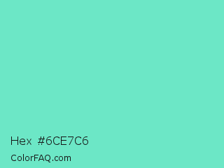 Hex #6ce7c6 Color is a light cyan color and the nearest color is Bermuda #7dd8c6. Hex code #6ce7c6 and RGB value is rgb(108,231,198). In RGB color space, this color is composed of 42% red, 91% green, 78% blue, In CMYK color space, this color is composed of 53% cyan, 0% magenta, 14% yellow , 9% black , In HSL color space, this color has a hue angle of 164° , 72% saturation and 66% lightness.