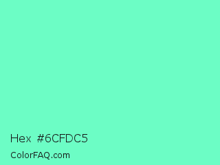 Hex #6cfdc5 Color is a light green color and the nearest color is Aquamarine #7fffd4. Hex code #6cfdc5 and RGB value is rgb(108,253,197). In RGB color space, this color is composed of 42% red, 99% green, 77% blue, In CMYK color space, this color is composed of 57% cyan, 0% magenta, 22% yellow , 1% black , In HSL color space, this color has a hue angle of 157° , 97% saturation and 71% lightness.