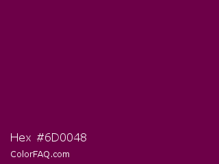 Hex #6d0048 Color is a very dark magenta color and the nearest color is Pompadour #660045. Hex code #6d0048 and RGB value is rgb(109,0,72). In RGB color space, this color is composed of 43% red, 0% green, 28% blue, In CMYK color space, this color is composed of 0% cyan, 100% magenta, 34% yellow , 57% black , In HSL color space, this color has a hue angle of 320° , 100% saturation and 21% lightness.