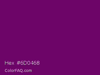 Hex #6d0468 Color is a very dark magenta color and the nearest color is Patriarch #800080. Hex code #6d0468 and RGB value is rgb(109,4,104). In RGB color space, this color is composed of 43% red, 2% green, 41% blue, In CMYK color space, this color is composed of 0% cyan, 96% magenta, 5% yellow , 57% black , In HSL color space, this color has a hue angle of 303° , 93% saturation and 22% lightness.
