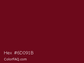 Hex #6d091b Color is a dark red color and the nearest color is Dark Tan #661010. Hex code #6d091b and RGB value is rgb(109,9,27). In RGB color space, this color is composed of 43% red, 4% green, 11% blue, In CMYK color space, this color is composed of 0% cyan, 92% magenta, 75% yellow , 57% black , In HSL color space, this color has a hue angle of 349° , 85% saturation and 23% lightness.