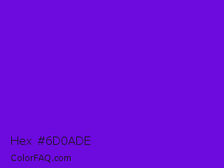 Hex #6d0ade Color is a normal violet color and the nearest color is French Violet #8806ce. Hex code #6d0ade and RGB value is rgb(109,10,222). In RGB color space, this color is composed of 43% red, 4% green, 87% blue, In CMYK color space, this color is composed of 51% cyan, 95% magenta, 0% yellow , 13% black , In HSL color space, this color has a hue angle of 268° , 91% saturation and 45% lightness.