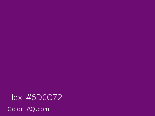 Hex #6d0c72 Color is a dark magenta color and the nearest color is Midnight #702670. Hex code #6d0c72 and RGB value is rgb(109,12,114). In RGB color space, this color is composed of 43% red, 5% green, 45% blue, In CMYK color space, this color is composed of 4% cyan, 89% magenta, 0% yellow , 55% black , In HSL color space, this color has a hue angle of 297° , 81% saturation and 25% lightness.