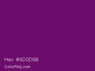 Hex #6d0d6b Color is a dark magenta color and the nearest color is Midnight #702670. Hex code #6d0d6b and RGB value is rgb(109,13,107). In RGB color space, this color is composed of 43% red, 5% green, 42% blue, In CMYK color space, this color is composed of 0% cyan, 88% magenta, 2% yellow , 57% black , In HSL color space, this color has a hue angle of 301° , 79% saturation and 24% lightness.