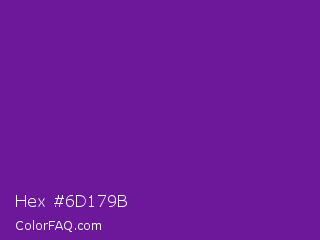 Hex #6d179b Color is a normal purple color and the nearest color is Seance #731e8f. Hex code #6d179b and RGB value is rgb(109,23,155). In RGB color space, this color is composed of 43% red, 9% green, 61% blue, In CMYK color space, this color is composed of 30% cyan, 85% magenta, 0% yellow , 39% black , In HSL color space, this color has a hue angle of 279° , 74% saturation and 35% lightness.