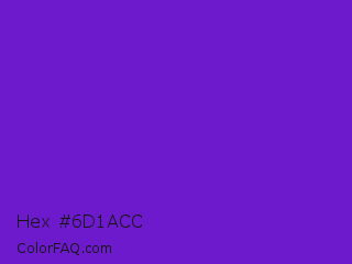 Hex #6d1acc Color is a normal violet color and the nearest color is Purple Heart Crayola #652dc1. Hex code #6d1acc and RGB value is rgb(109,26,204). In RGB color space, this color is composed of 43% red, 10% green, 80% blue, In CMYK color space, this color is composed of 47% cyan, 87% magenta, 0% yellow , 20% black , In HSL color space, this color has a hue angle of 268° , 77% saturation and 45% lightness.