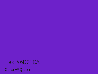Hex #6d21ca Color is a normal violet color and the nearest color is Purple Heart Crayola #652dc1. Hex code #6d21ca and RGB value is rgb(109,33,202). In RGB color space, this color is composed of 43% red, 13% green, 79% blue, In CMYK color space, this color is composed of 46% cyan, 84% magenta, 0% yellow , 21% black , In HSL color space, this color has a hue angle of 267° , 72% saturation and 46% lightness.