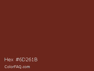 Hex #6d261b Color is a dark red color and the nearest color is Metallic Copper #71291d. Hex code #6d261b and RGB value is rgb(109,38,27). In RGB color space, this color is composed of 43% red, 15% green, 11% blue, In CMYK color space, this color is composed of 0% cyan, 65% magenta, 75% yellow , 57% black , In HSL color space, this color has a hue angle of 8° , 60% saturation and 27% lightness.