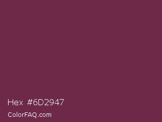 Hex #6d2947 Color is a dark rose color and the nearest color is Tawny Port #692545. Hex code #6d2947 and RGB value is rgb(109,41,71). In RGB color space, this color is composed of 43% red, 16% green, 28% blue, In CMYK color space, this color is composed of 0% cyan, 62% magenta, 35% yellow , 57% black , In HSL color space, this color has a hue angle of 334° , 45% saturation and 29% lightness.
