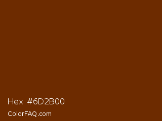 Hex #6d2b00 Color is a very dark orange color and the nearest color is Nutmeg Wood Finish #683600. Hex code #6d2b00 and RGB value is rgb(109,43,0). In RGB color space, this color is composed of 43% red, 17% green, 0% blue, In CMYK color space, this color is composed of 0% cyan, 61% magenta, 100% yellow , 57% black , In HSL color space, this color has a hue angle of 24° , 100% saturation and 21% lightness.