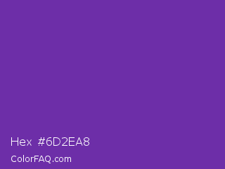 Hex #6d2ea8 Color is a normal purple color and the nearest color is Grape #6f2da8. Hex code #6d2ea8 and RGB value is rgb(109,46,168). In RGB color space, this color is composed of 43% red, 18% green, 66% blue, In CMYK color space, this color is composed of 35% cyan, 73% magenta, 0% yellow , 34% black , In HSL color space, this color has a hue angle of 271° , 57% saturation and 42% lightness.
