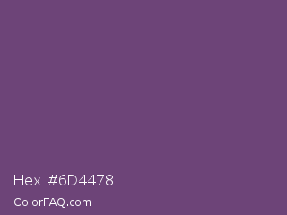 Hex #6d4478 Color is a normal purple color and the nearest color is Maximum Purple #733380. Hex code #6d4478 and RGB value is rgb(109,68,120). In RGB color space, this color is composed of 43% red, 27% green, 47% blue, In CMYK color space, this color is composed of 9% cyan, 43% magenta, 0% yellow , 53% black , In HSL color space, this color has a hue angle of 287° , 28% saturation and 37% lightness.