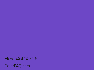 Hex #6d47c6 Color is a normal indigo color and the nearest color is Slate Blue #6a5acd. Hex code #6d47c6 and RGB value is rgb(109,71,198). In RGB color space, this color is composed of 43% red, 28% green, 78% blue, In CMYK color space, this color is composed of 45% cyan, 64% magenta, 0% yellow , 22% black , In HSL color space, this color has a hue angle of 258° , 53% saturation and 53% lightness.