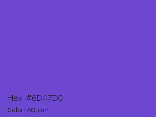 Hex #6d47d0 Color is a normal indigo color and the nearest color is Slate Blue #6a5acd. Hex code #6d47d0 and RGB value is rgb(109,71,208). In RGB color space, this color is composed of 43% red, 28% green, 82% blue, In CMYK color space, this color is composed of 48% cyan, 66% magenta, 0% yellow , 18% black , In HSL color space, this color has a hue angle of 257° , 59% saturation and 55% lightness.