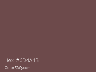 Hex #6d4a4b Color is a normal red color and the nearest color is Medium Taupe #674c47. Hex code #6d4a4b and RGB value is rgb(109,74,75). In RGB color space, this color is composed of 43% red, 29% green, 29% blue, In CMYK color space, this color is composed of 0% cyan, 32% magenta, 31% yellow , 57% black , In HSL color space, this color has a hue angle of 358° , 19% saturation and 36% lightness.