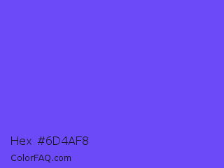 Hex #6d4af8 Color is a light indigo color and the nearest color is Very Light Blue #6666ff. Hex code #6d4af8 and RGB value is rgb(109,74,248). In RGB color space, this color is composed of 43% red, 29% green, 97% blue, In CMYK color space, this color is composed of 56% cyan, 70% magenta, 0% yellow , 3% black , In HSL color space, this color has a hue angle of 252° , 93% saturation and 63% lightness.