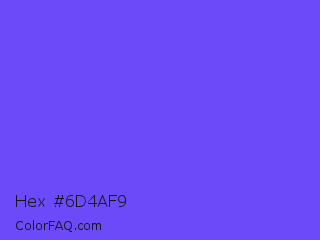 Hex #6d4af9 Color is a light indigo color and the nearest color is Very Light Blue #6666ff. Hex code #6d4af9 and RGB value is rgb(109,74,249). In RGB color space, this color is composed of 43% red, 29% green, 98% blue, In CMYK color space, this color is composed of 56% cyan, 70% magenta, 0% yellow , 2% black , In HSL color space, this color has a hue angle of 252° , 94% saturation and 63% lightness.