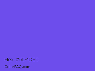 Hex #6d4dec Color is a light indigo color and the nearest color is Majorelle Blue #6050dc. Hex code #6d4dec and RGB value is rgb(109,77,236). In RGB color space, this color is composed of 43% red, 30% green, 93% blue, In CMYK color space, this color is composed of 54% cyan, 67% magenta, 0% yellow , 7% black , In HSL color space, this color has a hue angle of 252° , 81% saturation and 61% lightness.