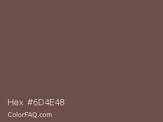 Hex #6d4e48 Color is a normal red color and the nearest color is Medium Taupe #674c47. Hex code #6d4e48 and RGB value is rgb(109,78,72). In RGB color space, this color is composed of 43% red, 31% green, 28% blue, In CMYK color space, this color is composed of 0% cyan, 28% magenta, 34% yellow , 57% black , In HSL color space, this color has a hue angle of 10° , 20% saturation and 35% lightness.