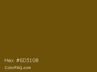 Hex #6d5108 Color is a dark orange color and the nearest color is Antique Bronze #704a07. Hex code #6d5108 and RGB value is rgb(109,81,8). In RGB color space, this color is composed of 43% red, 32% green, 3% blue, In CMYK color space, this color is composed of 0% cyan, 26% magenta, 93% yellow , 57% black , In HSL color space, this color has a hue angle of 43° , 86% saturation and 23% lightness.