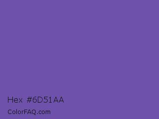 Hex #6d51aa Color is a normal indigo color and the nearest color is Royal Purple #7851a9. Hex code #6d51aa and RGB value is rgb(109,81,170). In RGB color space, this color is composed of 43% red, 32% green, 67% blue, In CMYK color space, this color is composed of 36% cyan, 52% magenta, 0% yellow , 33% black , In HSL color space, this color has a hue angle of 259° , 35% saturation and 49% lightness.