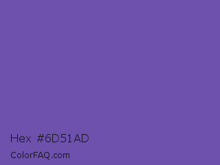 Hex #6d51ad Color is a normal indigo color and the nearest color is Studio #714ab2. Hex code #6d51ad and RGB value is rgb(109,81,173). In RGB color space, this color is composed of 43% red, 32% green, 68% blue, In CMYK color space, this color is composed of 37% cyan, 53% magenta, 0% yellow , 32% black , In HSL color space, this color has a hue angle of 258° , 36% saturation and 50% lightness.