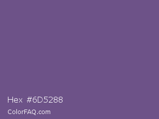 Hex #6d5288 Color is a normal violet color and the nearest color is Dark Lavender #734f96. Hex code #6d5288 and RGB value is rgb(109,82,136). In RGB color space, this color is composed of 43% red, 32% green, 53% blue, In CMYK color space, this color is composed of 20% cyan, 40% magenta, 0% yellow , 47% black , In HSL color space, this color has a hue angle of 270° , 25% saturation and 43% lightness.