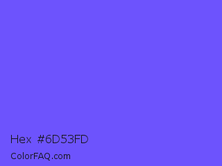 Hex #6d53fd Color is a light indigo color and the nearest color is Very Light Blue #6666ff. Hex code #6d53fd and RGB value is rgb(109,83,253). In RGB color space, this color is composed of 43% red, 33% green, 99% blue, In CMYK color space, this color is composed of 57% cyan, 67% magenta, 0% yellow , 1% black , In HSL color space, this color has a hue angle of 249° , 98% saturation and 66% lightness.