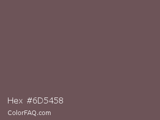 Hex #6d5458 Color is a normal red color and the nearest color is Dorado #6b5755. Hex code #6d5458 and RGB value is rgb(109,84,88). In RGB color space, this color is composed of 43% red, 33% green, 35% blue, In CMYK color space, this color is composed of 0% cyan, 23% magenta, 19% yellow , 57% black , In HSL color space, this color has a hue angle of 350° , 13% saturation and 38% lightness.